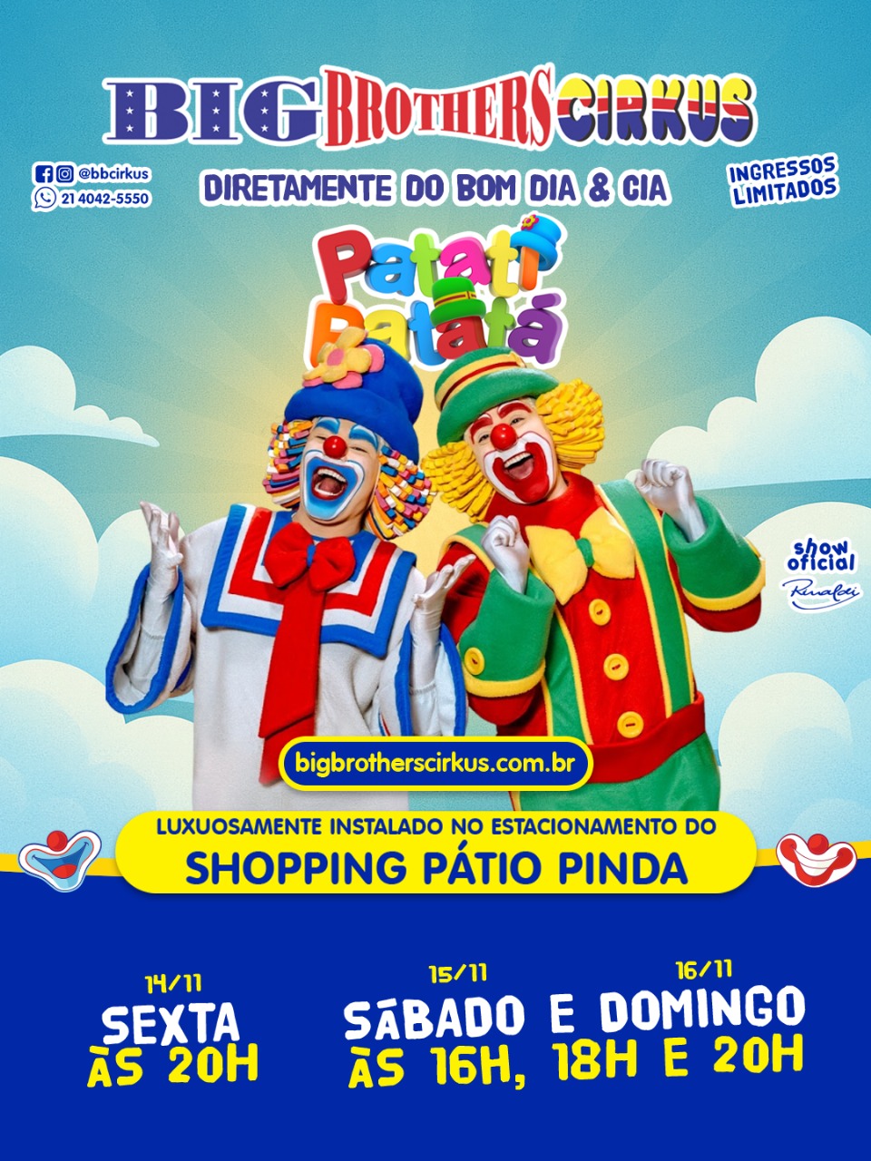 O Shopping Pátio Pinda, administrado pelo Grupo AD, recebe, entre os dias 14 e 16 de novembro, o espetáculo oficial da dupla Patati Patatá, em conjunto ao Big Brothers Cirkus. Montado no estacionamento do shopping, o evento terá ingressos promocionais a partir de R$20 e promete divertir o público infantil com um show lúdico e alegre.