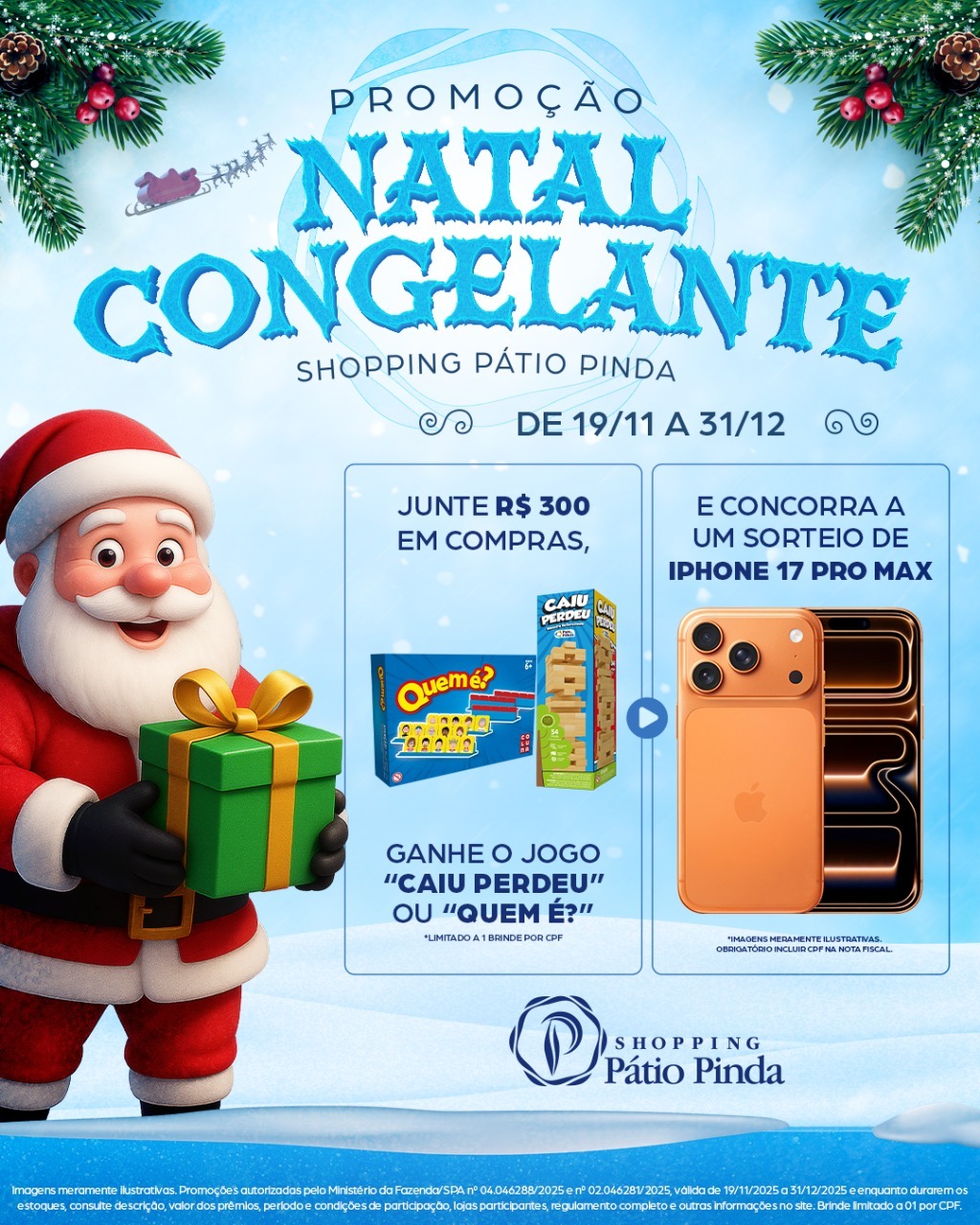 O Shopping Pátio Pinda, administrado pelo Grupo AD, dá início a mais uma campanha natalina, com experiências e atrações para toda a família. A partir do dia 19 de novembro, o centro de compras lança a campanha promocional, com o tema “Natal Congelante”, com prêmios no formato de compre e ganhe e sorteio, em uma das épocas mais especiais do ano.