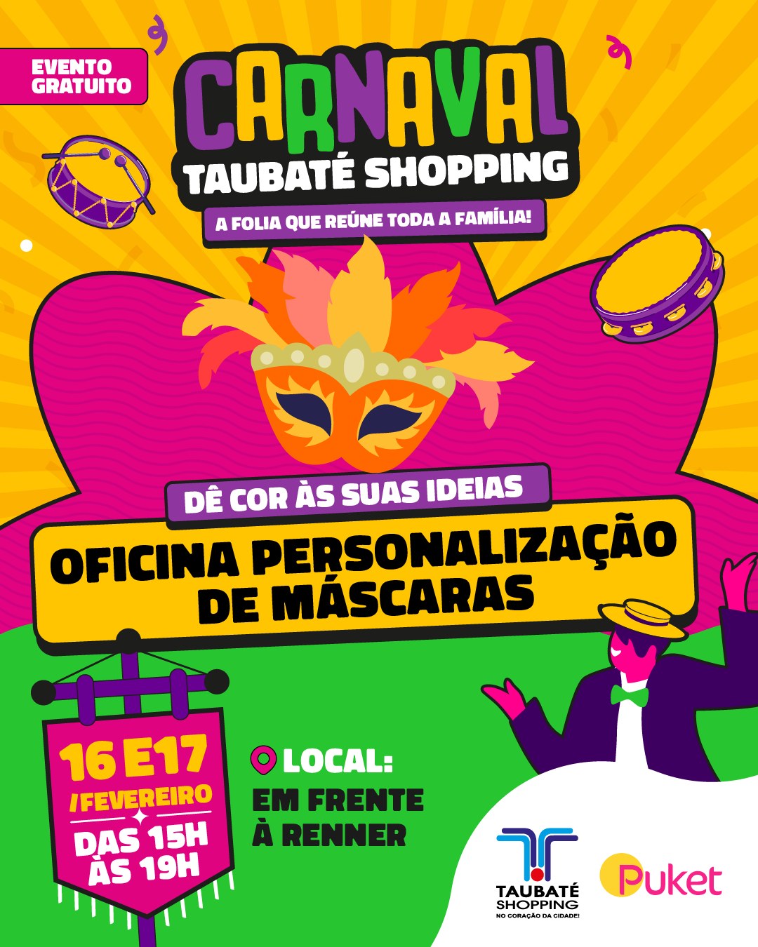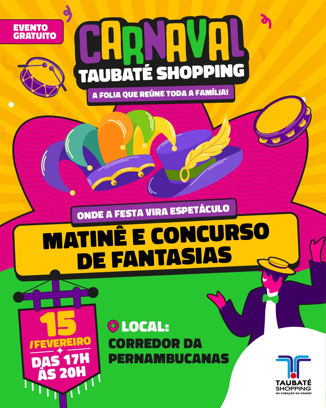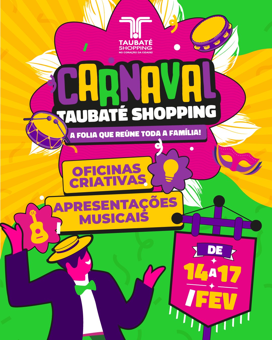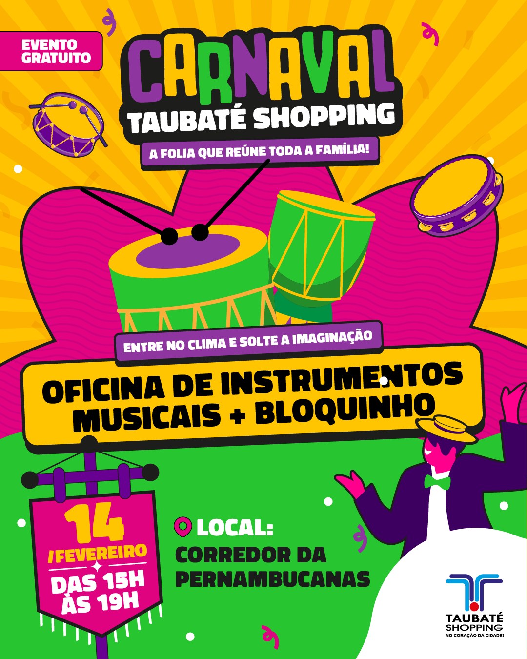 O Taubaté Shopping, administrado pelo Grupo AD, preparou uma programação especial de Carnaval para animar crianças e adultos com atrações que unem música, oficinas e diversão. As atividades acontecem durante os quatro dias de folia, de 14 a 17 de fevereiro, com bloquinhos, concursos de fantasia e cabelo maluco e apresentações musicais.
