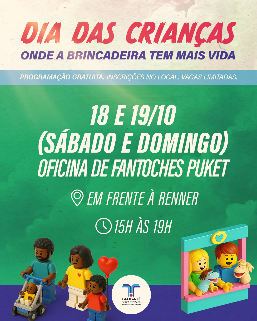 Seguindo o cronograma do Mês das Crianças, nos dias 18 e 19 de outubro, acontece a Oficina de Fantoches Puket, uma atividade que busca estimular a criatividade das crianças, de maneira simples e divertida. A ação é gratuita e acontece em frente à loja Renner, das 15h às 19h.