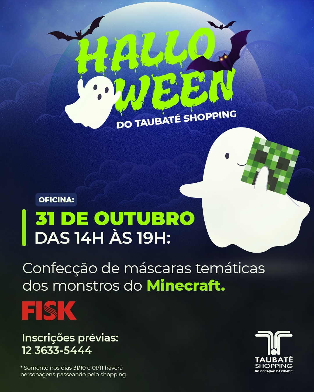 No dia 31 de outubro, o shopping realiza uma oficina em parceria com a Fisk, onde as crianças poderão participar da confecção de máscaras temáticas inspiradas nos monstros do famoso jogo Minecraft. A ação acontece das 14h às 19h e conta com vagas limitadas, para participar, deve ser realizado a inscrição previamente pelo telefone: (12) 3633-5444.