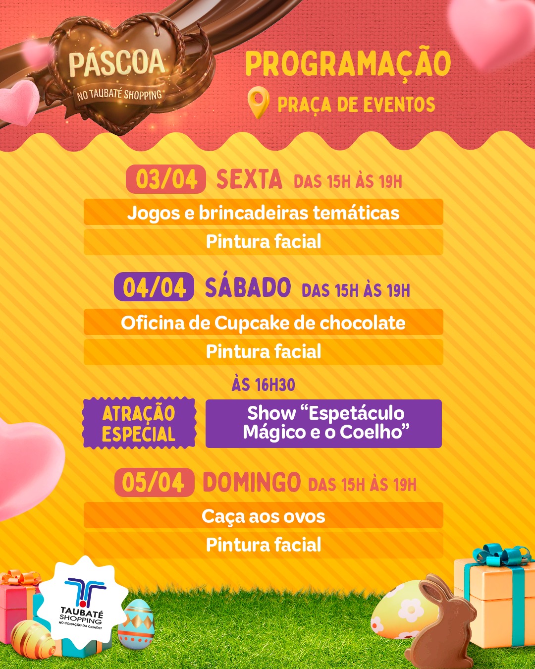 Além da encenação, o Taubaté Shopping também promove atividades e brincadeiras voltadas ao público infantil e famílias. A programação começa na sexta-feira (3), das 15h às 19h, com jogos e brincadeiras temáticas. No sábado (4), no mesmo horário, acontece a Oficina de Cupcake de chocolate, além do espetáculo “Mágico e o coelho”, das 16h30 às 17h20. O cronograma termina no domingo (5) com a tradicional Caça aos ovos, das 15h às 19h. A agenda ainda conta com pintural facial todos os dias, das 15h às 19h. Toda a programação é gratuita e estará localizada na Praça de Eventos.