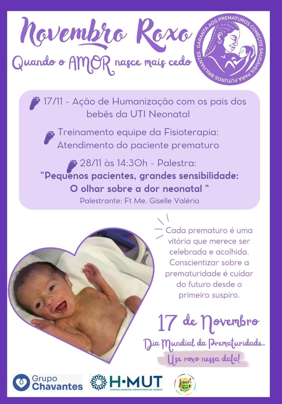 O Hospital Municipal Universitário de Taubaté (HMUT), sob gestão do Grupo Chavantes, realiza ao longo do mês uma programação especial dedicada ao Novembro Roxo, campanha internacional de conscientização sobre a prematuridade. Com o tema “Quando o amor nasce mais cedo”, as atividades reforçam a importância do cuidado humanizado, da informação e do acolhimento às famílias que passam pelo nascimento prematuro.