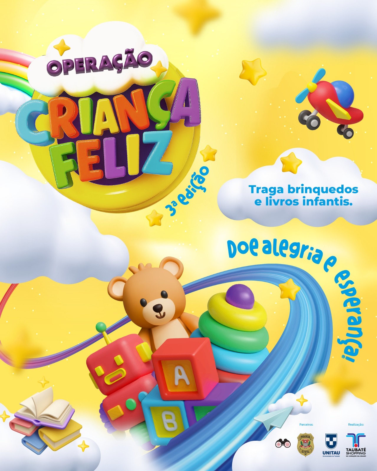 Em parceria com a Polícia Civil, o Taubaté Shopping, administrado pelo Grupo AD, realiza a 3ª edição da Operação Criança Feliz, uma ação que busca arrecadar brinquedos e levar alegria e esperança para crianças da região. A iniciativa convida os clientes a fazer uma boa ação, doando brinquedos e livros infantis, novos ou usados em bom estado. As doações podem ser entregues de 1 a 31 de outubro, na Praça de Alimentação do centro de compras.