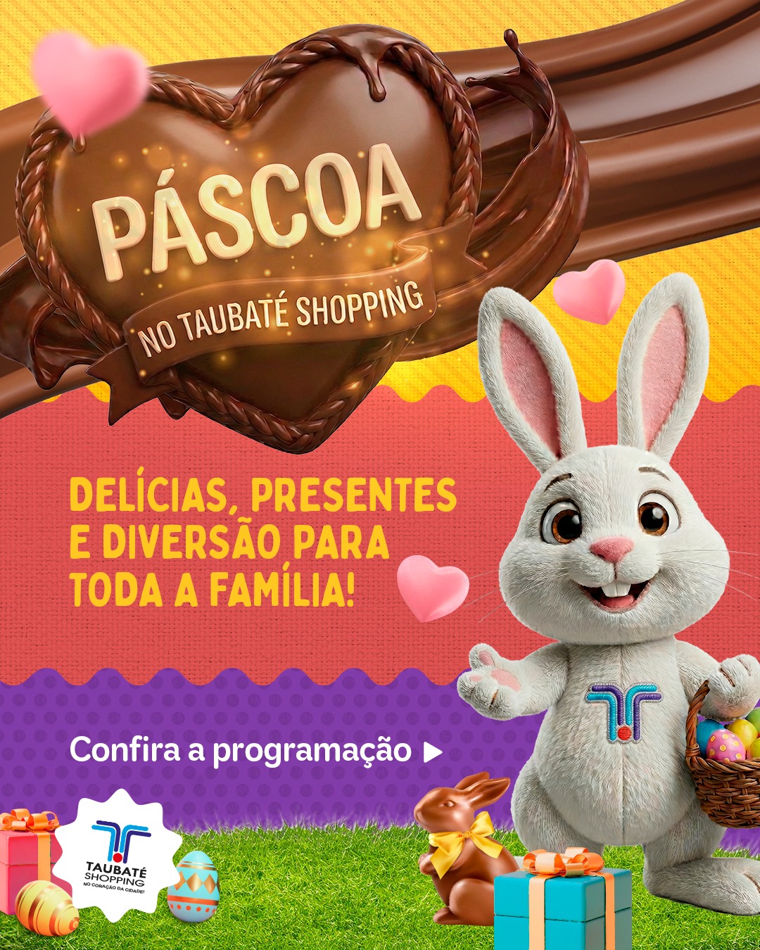 Para celebrar a Páscoa, o Taubaté Shopping, administrado pelo Grupo AD, lançou uma programação gratuita, voltada ao público infantil, com diversas atrações. As atividades acontecem nos dias 3, 4 e 5 de abril, na Praça de Eventos e promete encantar as famílias no centro de compras e lazer.