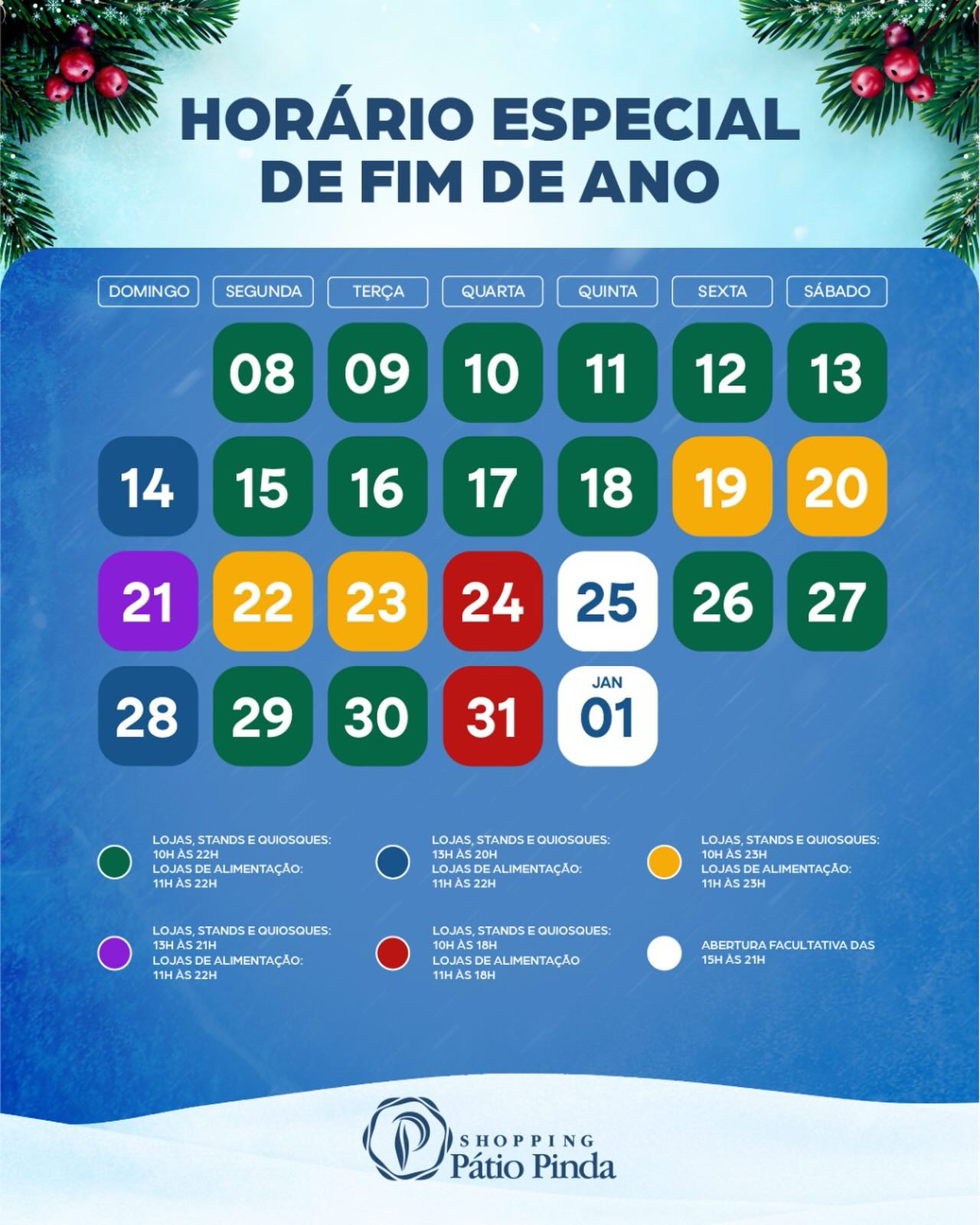 O Shopping Pátio Pinda, administrado pelo Grupo AD, anuncia os horários especiais de funcionamento para o período de fim de ano, garantindo mais praticidade aos clientes que desejam realizar suas compras com tranquilidade e conforto.