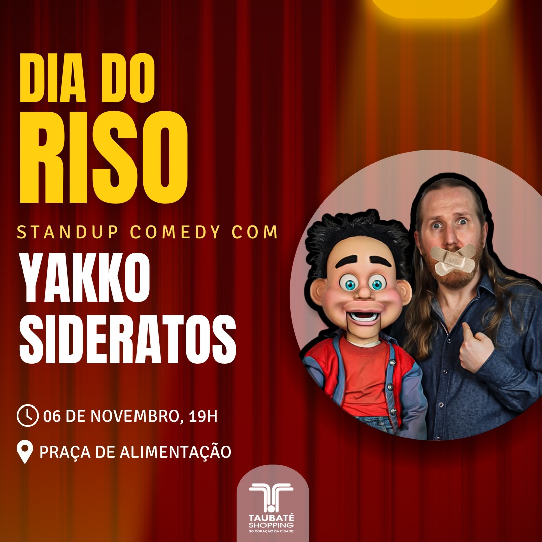 Para comemorar o Dia Nacional do Riso, celebrado no dia 6 de novembro, o Taubaté Shopping, administrado pelo Grupo AD, apresenta ao público um Stand-up Comedy com o ator, dublador, ventríloquo e humorista brasileiro Yakko Sideratos. O evento é gratuito e acontece na quinta-feira (6), às 19h, na Praça de Alimentação do centro de compras e lazer.