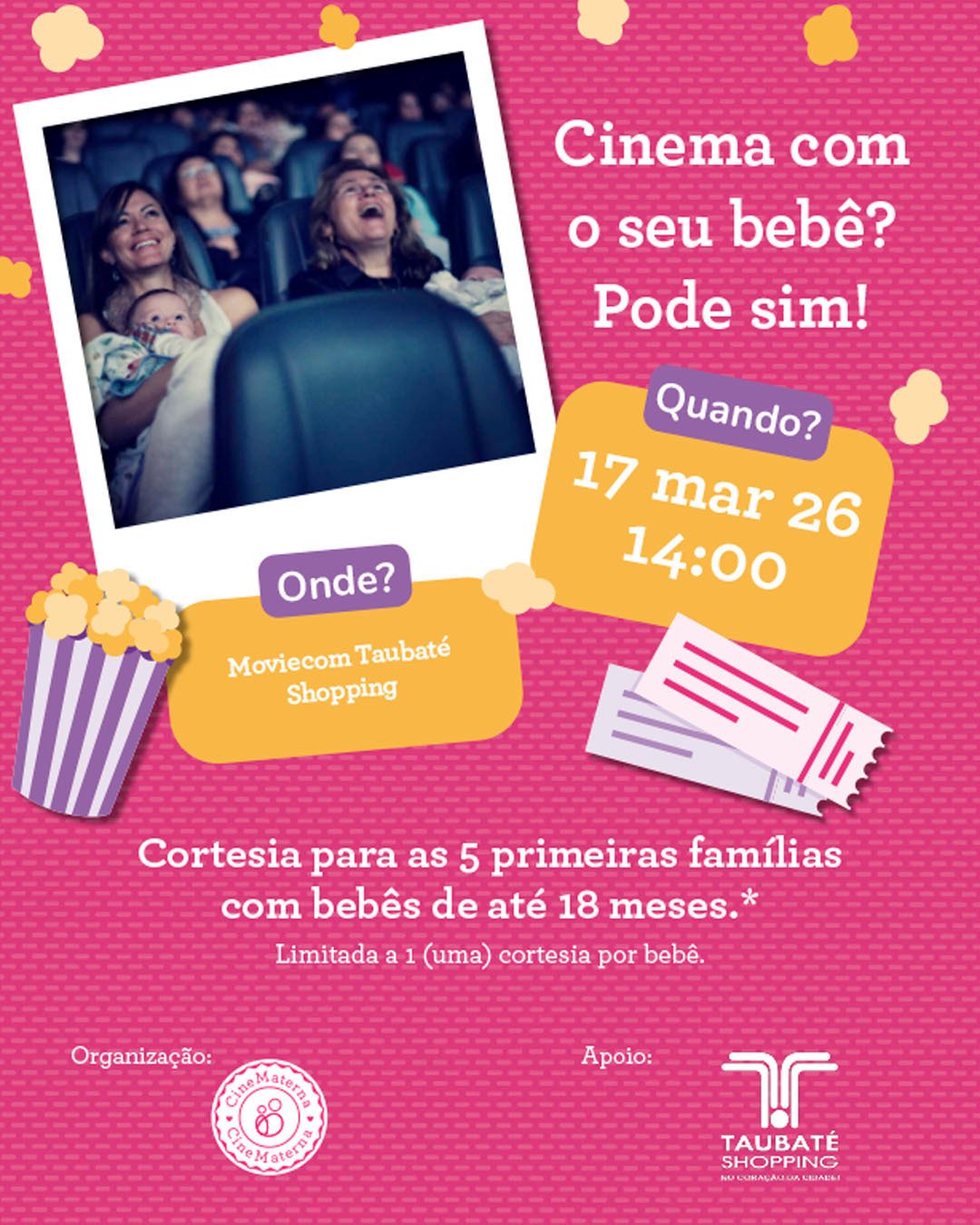 O Taubaté Shopping, administrado pelo Grupo AD, recebe mais uma edição do projeto CineMaterna, uma iniciativa que proporciona uma sessão de cinema especial para mães, pais e bebês de até 18 meses. Neste mês, o evento acontece na próxima terça-feira, 17 de março, às 14h, na Moviecom Cinemas.
